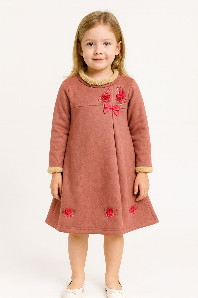 This elegant frock is crafted in a warm rose-brown shade, perfect for winter wear. It features soft fur detailing at the collar and sleeve ends, adding both comfort and style. The frock is beautifully decorated with intricate rose embroidery and a satin bow on the chest, along with delicate floral motifs near the hemline. Its long sleeves and cozy fabric make it an ideal choice for special occasions or outings during cooler days, keeping your little one both stylish and snug.
