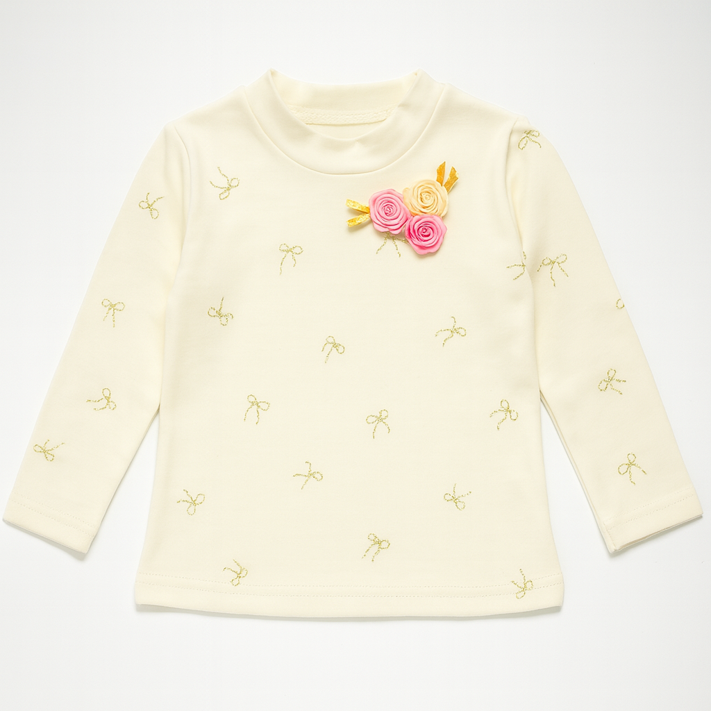 Charming ivory girls’ top with a cozy mock neck and full sleeves. It features delicate gold bow motifs all over and a cute 3D rosette corsage at the shoulder for a dressy touch. Soft, skin-friendly stretch fabric keeps her comfy—perfect with jeans, leggings, or skirts for outings, parties, and everyday wear.