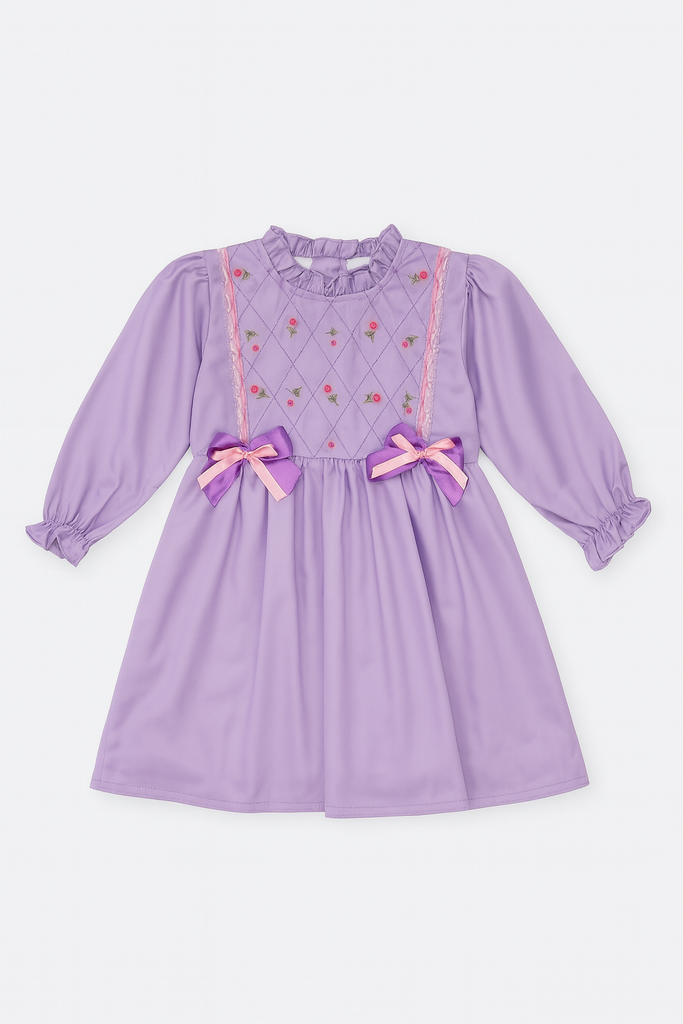 Sweet and elegant, this lavender long-sleeve dress is perfect for your little one’s special days. The front yoke features diamond-pattern embroidery with tiny rosebuds, framed by delicate pink lace. A soft ruffle neck, gathered sleeves with frill cuffs, and two contrast bows at the waist complete the adorable look. Made from soft, skin-friendly fabric with a gently flared skirt for all-day comfort—ideal for birthdays, festivals, outings, and photoshoots.