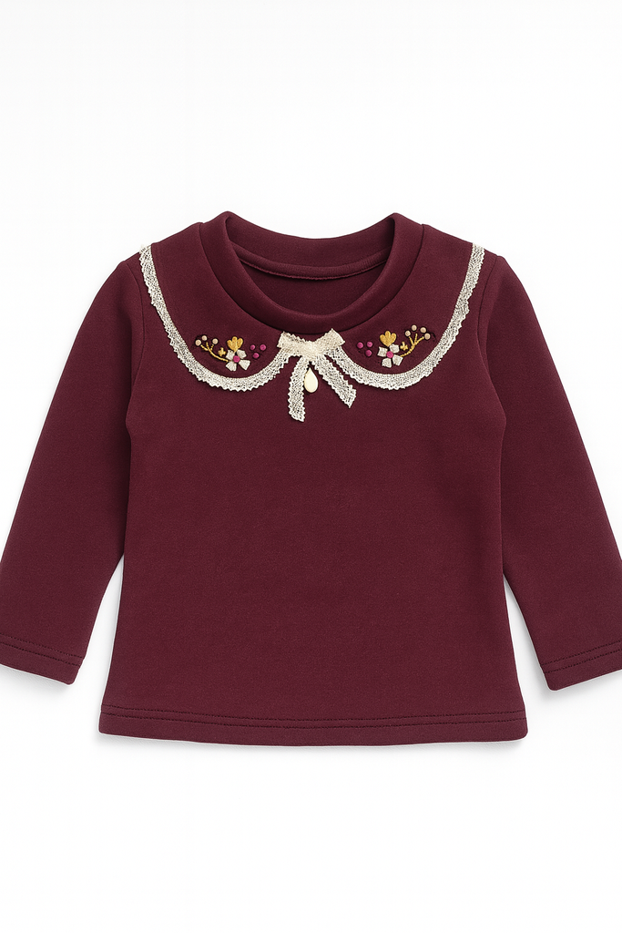 A stylish maroon baby top with full sleeves, designed in soft and cozy fabric for everyday comfort. The neckline features a delicate lace-trimmed Peter Pan collar, accented with tiny floral embroidery and a cream bow in the center for added charm. Perfect for pairing with skirts, jeans, or leggings—ideal for casual wear and special outings.