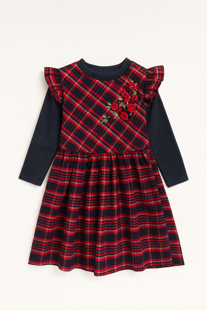 Cozy navy-and-red tartan dress with full sleeves and sweet ruffle shoulders. The bodice features diagonal plaid placement and delicate red rose embroidery, while the gathered skirt gives a twirl-friendly flare. Soft, warm fabric keeps her comfy for outings, birthdays, and festive winter days.