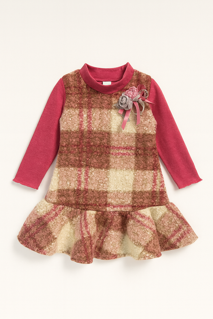 Cozy layered-look winter dress with a rose-pink knit inner and a soft boucle plaid overlay in blush and cocoa tones. Features a neat mock neck, drop-waist ruffle hem for playful movement, and a velvet flower corsage with ribbon detail at the shoulder. Warm, comfy, and perfect for outings, birthdays, and festive photos.