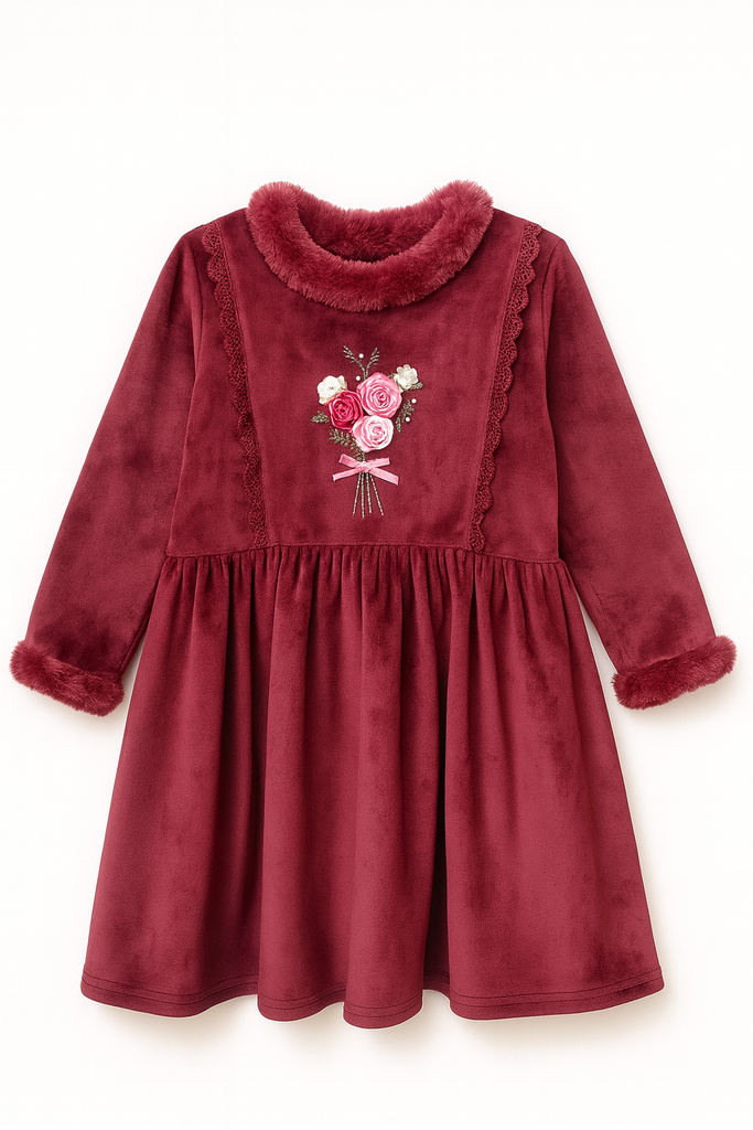 Luxuriously soft and warm, this wine-coloured velour dress features a plush faux-fur collar and cuffs, delicate lace panels on the bodice, and a pretty rose-bouquet embroidery finished with a tiny satin bow. The gathered skirt gives a gentle twirl, making it perfect for parties, family dinners and festive outings all winter long.